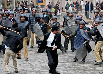 Although there is much cooperation with the protesting lawyers, journalists and civil society activists, the student movement is a youth initiative. It uses technology in a way that would not have been possible in earlier decades. Virtually all students who have access to it use the Internet. Some use it to voice their protests in the form of websites and blog posts; others use it to watch reportage from the private television channel, the Urdu-language GEO TV, which is now being broadcast from Dubai. There are multiple Facebook groups that connect students in different parts of the world and list upcoming protests. And cell phones are used to organize “flash protests.” A text message is sent out to a relatively small group of people, who gather at a crowded area, shout slogans and hand out pamphlets, then disperse as quickly as they arrived, before they can be arrested.