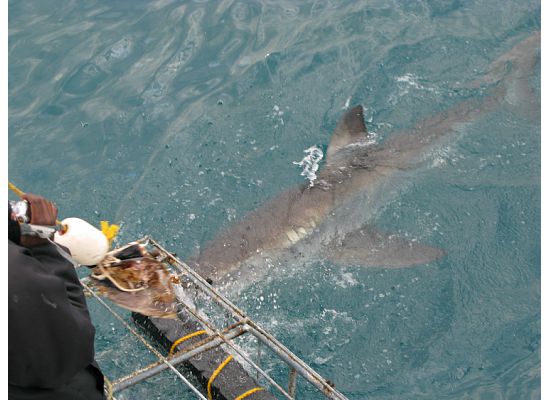 After eating just enough to stop our stomachs from growling, we were herded upstairs, where a slide show of fantastic photographs and factoids about great white sharks awaited us. Alison Towner, the leader of our trip, talked us through it. A British marine biologist, Towner was collecting data for her research on great whites. Every trip undertaken by Marine Dynamics, the tour operator we used, enables her to gather information on these mysterious creatures, and the money they generate helps fuel their shark conservation trust. It was the prime factor that helped us choose this company over myriad others that service the Cape Town area.