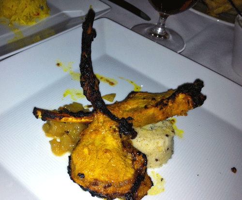 The main courses were truly exciting. What to get, what to get? Parsi fish—you know it as patra ni macchi, the steaming fillet in banana leaves that you unwrap like presents at Parsi weddings—with coconut, cilantro and sesame paste? Semolina-crusted curry monkfish with (gasp!) pomegranate sauce? Tandoori grilled wild boar chops? Tulsi chicken? Savory banana dumplings (I was leaning heavily toward these at first; next time) stuffed with figs and cashews? It went on and on, leaving my eyes giddy with greed.