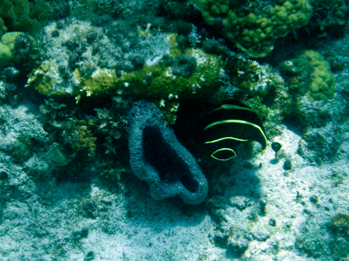 In this second video, there are too many fish in this video to describe them all, but the school of purple looking fish floating around are actually yellow grunt fish; the absorption of light in the water does funny things to color. The tiny black and yellow striped fish are sergeant majors, and the spiny black creature hiding out in the coral is a black sea urchin.