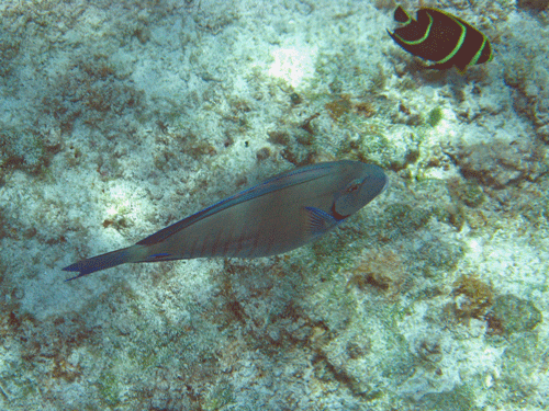In this first video, a grouper (in the background) and an unknown blue fish swim past. Taken while snorkeling off the western coast of Cozumel, just opposite the restaurant Paprika.